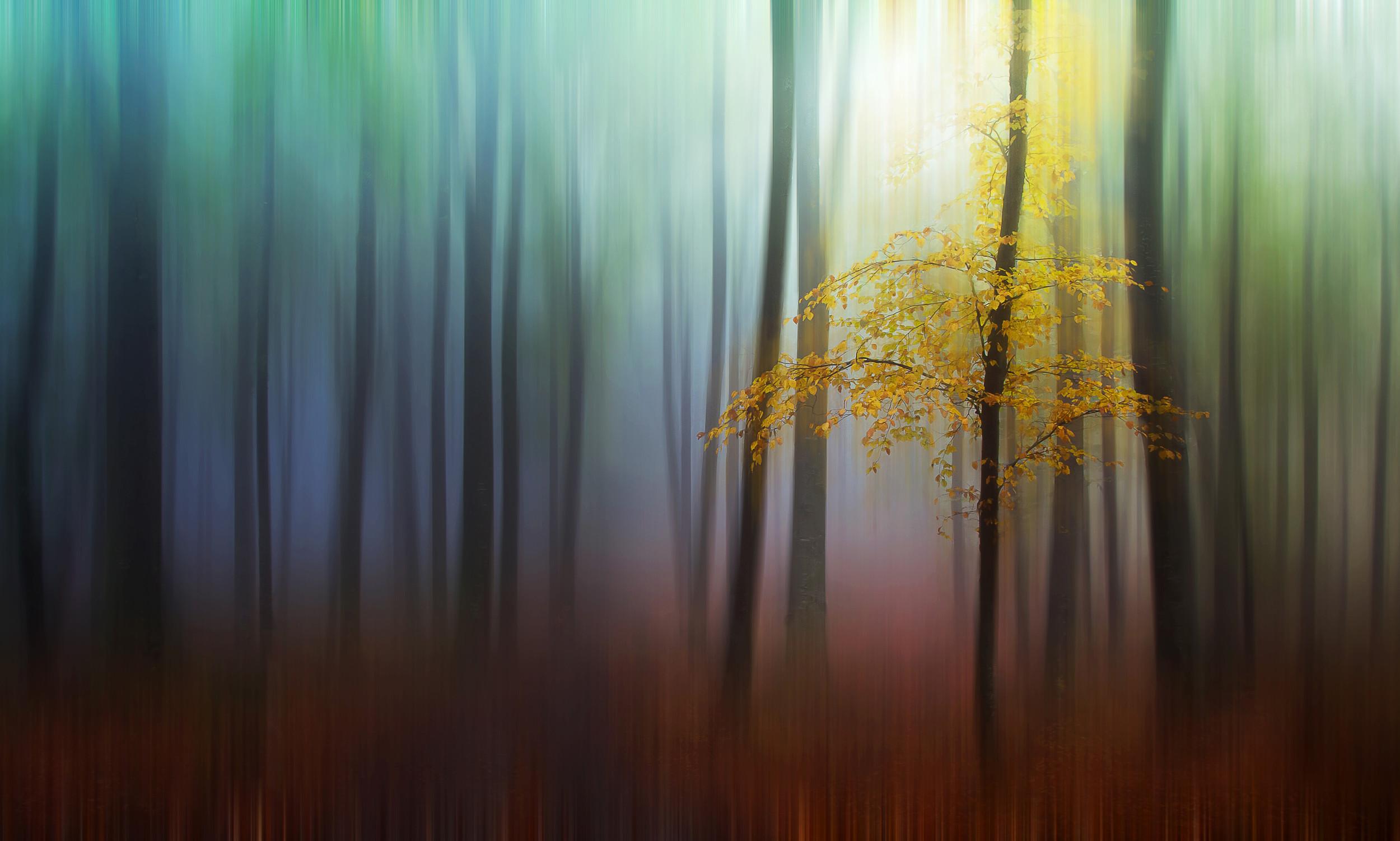 I admit that the idea for the final image was not in my mind the moment I took the photo of the tree with yellow leaves. A few months after I took that shot, I started to experiment with intentional camera movement (ICM) during exposure, and it just so happened that I was back in a wooded location. After creating a few vertical movement photos, I began to wonder how it might look with a combination of motion blur and a clear, sharp subject. Unfortunately, it was the start of summer so the forest didn’t look all that appealing. Then I remembered the photo shoot from the same location (back in autumn), so I started to look for a photo that had the right composition and coloring to suit this type of effect. I chose this photo specifically for the pop of yellow in the tree.The resulting image comes from one single shot in the forest. The initial photo is a straight shot (without camera movement) that I cropped a little to create a slightly panoramic effect, which helped draw attention to the subject. I didn't have my tripod with me the day I took this photo, and I soon realized that was a mistake: I continued to move deeper into the woods, and the mist and low light forced me to keep increasing my ISO setting. If I had had my tripod I might have used an aperture of f/16 and ISO 100 since there was no wind. There wasn't any special setup for this photo, it just happened. Walking through the forest, I found the yellow tree standing out in high contrast to everything surrounding it.